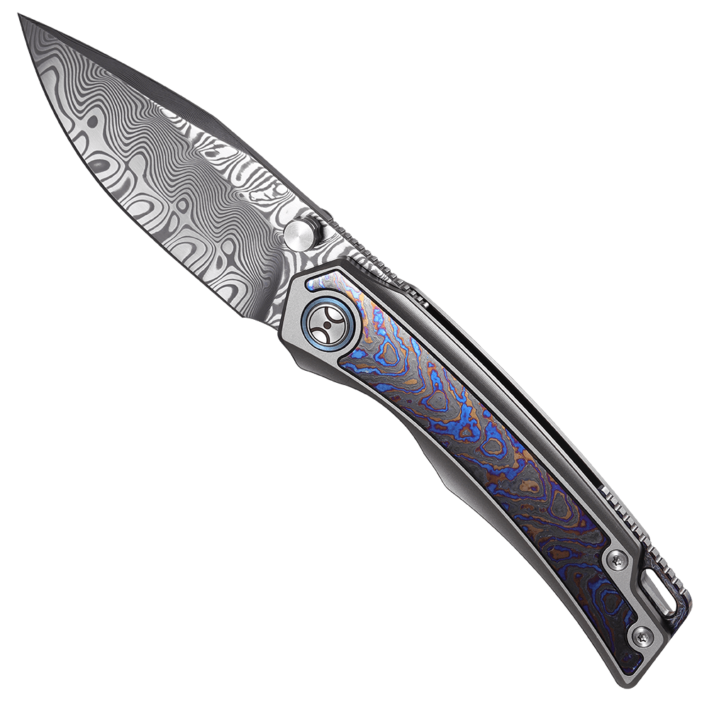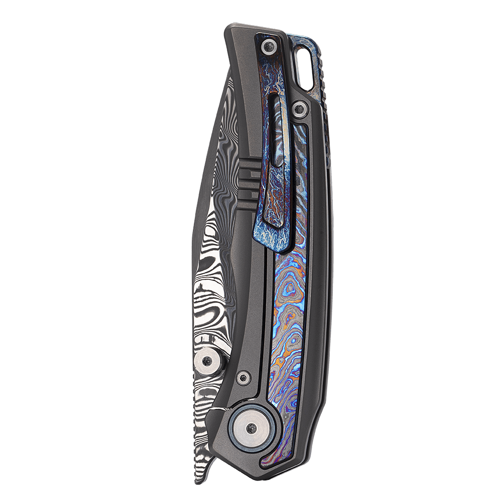 Its RWL34 + PMC27 Damascus steel blade—mirror-etched to reveal its layered grain—delivers superior edge retention, toughness, and corrosion resistance. A ceramic bearing system ensures seamless, one-hand deployment, while a titanium pocket clip and back spacer complete the build with lightweight durability.