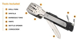 - MBT3 Foldable Grill Tool – A full-sized utensil that folds down for easy packing. It integrates a fork, spatula, knife, wine opener, and bottle opener into a single multitool. Its defining feature is the ability to lock together into a pair of tongs, offering better grip and control while handling food over heat.